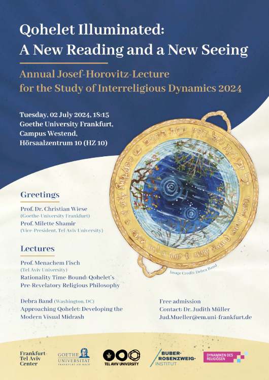 Die erste in der Reihe der jährlichen Vorlesungen halten die amerikanische Künstlerin Debra Band und der renommierte Tel Aviver Philosoph Prof. Menachem Fisch, die ihr gemeinsames Buch Qohelet: Searching for a Life Worth Living (2023) vorstellen. Eröffnet wird der Abend durch Grußworte von Prof. Christian Wiese und von Prof. Milette Shamir, der Vize-Präsidentin der Tel Aviv University. Menachem Fisch wird sodann über „Rationality Time Bound: Qohelet’s Pre-Revelatory Religious Philosophy” sprechen und Debra Band wird sich der Visualität des Buches Qohelet widmen: Ihr Vortragstitel lautet „Approaching Qohelet: Developing the Modern Visual Midrash.“ Gemeinsam spüren sie in ihren Interpretationen und Illuminationen des biblischen Buches Qohelet, das vielfach mit Skepsis und Hoffnungs- und Bedeutungslosigkeit in Verbindung gebracht wird, der Frage nach dem Wert des Lebens nach und eröffnen neue Perspektiven auf den biblischen Text. Gleichzeitig wird dieser Text mit der mittelalterlichen Tradition des Illustrierens sowie postmodernen Theorien zu Lebensfragen in einen Dialog gebracht.